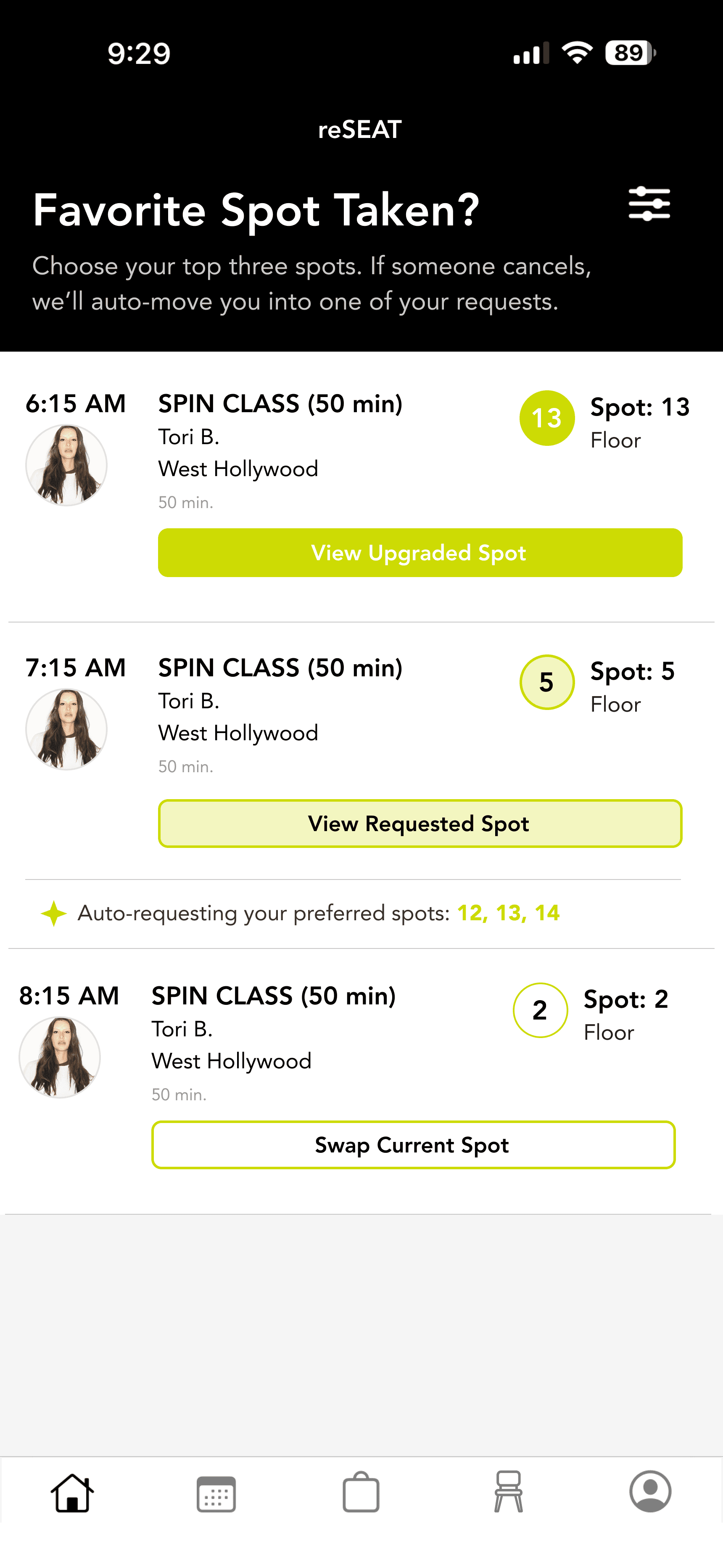 After booking, clients open the reSEAT tab and select the spots their preferred spots. They can choose to save these preferences for future classes.