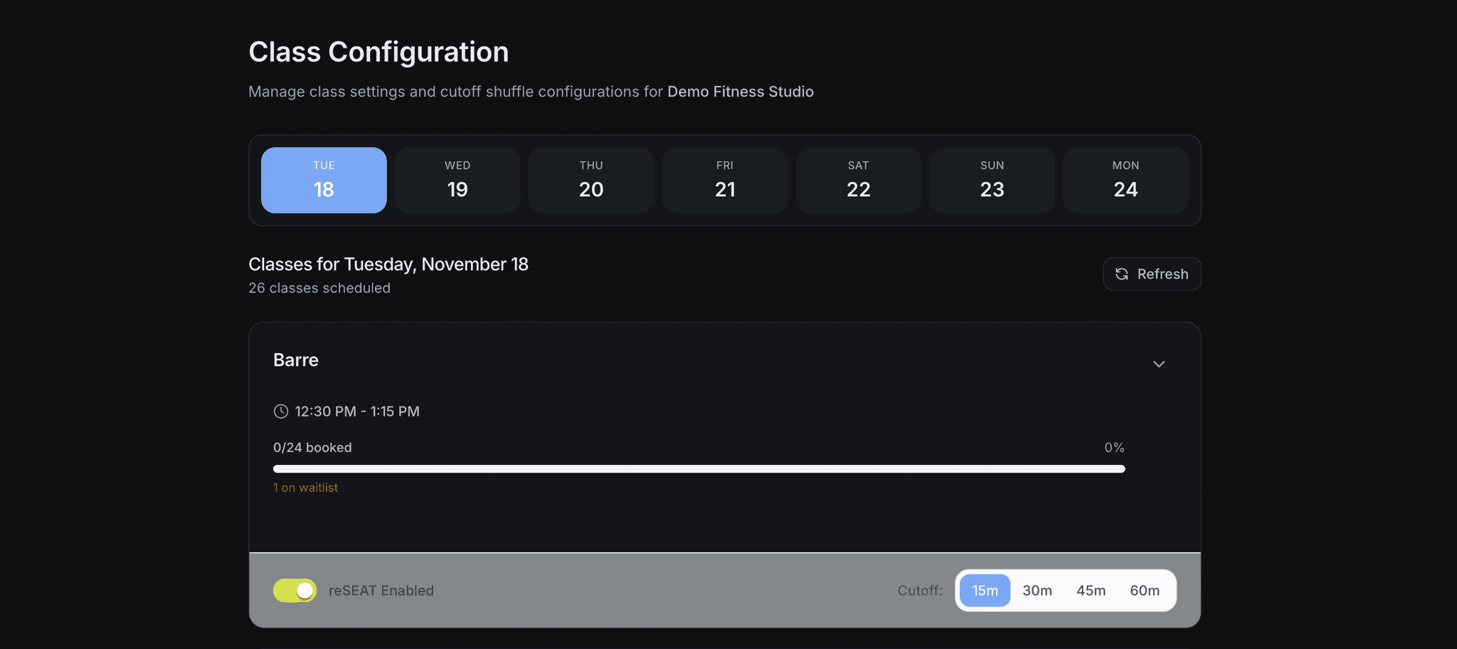 After booking, clients can open the reSEAT tab and choose the spots they’d love to upgrade into—whether that’s the front row, a specific treadmill, or a favorite corner.